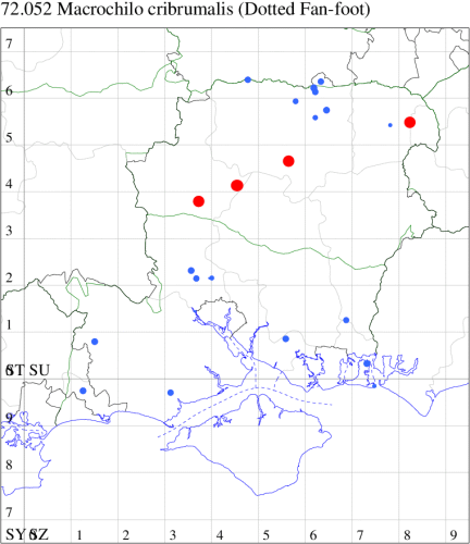 For the maps, all records prior to 2024 are shown by a blue dot (the larger the dot, the more recent), with the current year's records shown in red. As previous records are superimposed on any report for 2024, new sites have greater emphasis (i.e. will show as 'more red').
