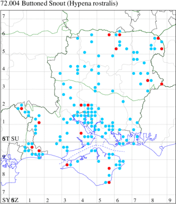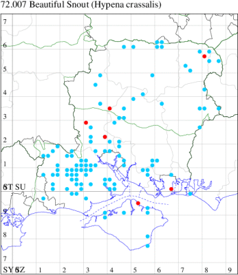 Nationally scarce (Nb) in hedgerows, woodland edges and gardens throughout much of south-eastern England, and a priority species under the UK Biodiversity Action Plan. In Hampshire and on the Isle of Wight very local, but since 1990 there does appear to have been an increase in the numbers reported, with a peak of 44 records in 2001. Wingspan 29-32 mm. The main confusion species is Bloxworth Snout H. obsitalis, which has the forewing more pointed and broader, with a conspicuous white patch below the costa outside the median fascia, followed by horizontal dashes (MBGBI Vol 10). Larva feeds on Hop.