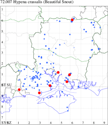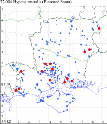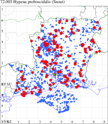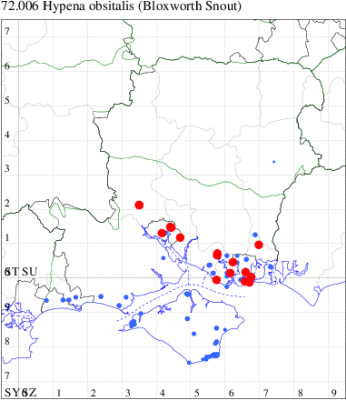Nationally scarce (Nb) in hedgerows, woodland edges and gardens throughout much of south-eastern England, and a priority species under the UK Biodiversity Action Plan. In Hampshire and on the Isle of Wight very local, but since 1990 there does appear to have been an increase in the numbers reported, with a peak of 44 records in 2001. Wingspan 29-32 mm. The main confusion species is Bloxworth Snout H. obsitalis, which has the forewing more pointed and broader, with a conspicuous white patch below the costa outside the median fascia, followed by horizontal dashes (MBGBI Vol 10). Larva feeds on Hop.