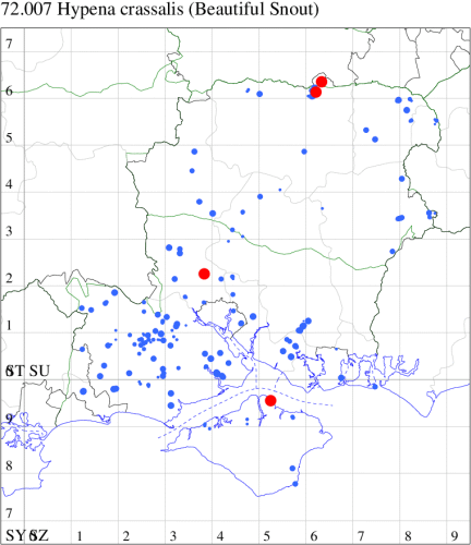 Nationally scarce (Nb) in hedgerows, woodland edges and gardens throughout much of south-eastern England, and a priority species under the UK Biodiversity Action Plan. In Hampshire and on the Isle of Wight very local, but since 1990 there does appear to have been an increase in the numbers reported, with a peak of 44 records in 2001. Wingspan 29-32 mm. The main confusion species is Bloxworth Snout H. obsitalis, which has the forewing more pointed and broader, with a conspicuous white patch below the costa outside the median fascia, followed by horizontal dashes (MBGBI Vol 10). Larva feeds on Hop.