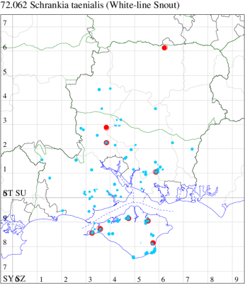 Local in damp woodland, fens, damp meadows and boggy heathland throughout England and Wales, and also in the Scottish Highlands. Widespread and locally common in Hampshire and on the Isle of Wight. Wingspan 19-22 mm. Small size suggests a species of micromoth, but most resembles White-line Snout S. taenialis. Larva feeds on Heather, Wild Marjoram and Wild Thyme.