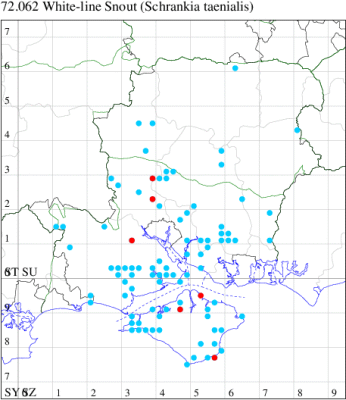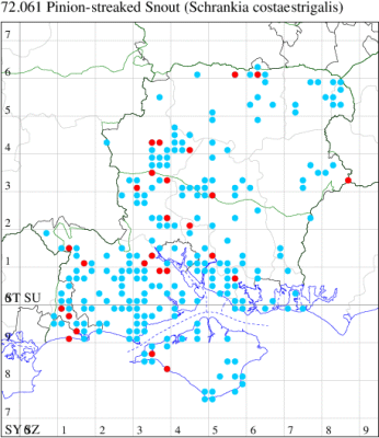Local in damp woodland, fens, damp meadows and boggy heathland throughout England and Wales, and also in the Scottish Highlands. Widespread and locally common in Hampshire and on the Isle of Wight. Wingspan 19-22 mm. Small size suggests a species of micromoth, but most resembles White-line Snout S. taenialis. Larva feeds on Heather, Wild Marjoram and Wild Thyme.