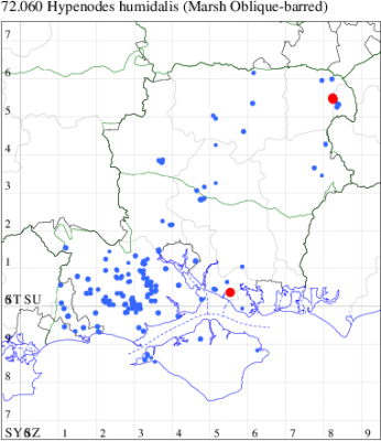 Nationally scarce (Nb) in bogs, moorland, damp heathland, fens, water meadows and marshes, from western England, through west Wales, to the Moray Firth in Scotland. In Hampshire locally abundant in bogs in the New Forest, quite scarce elsewhere with only a handful of records for the Isle of Wight. Wingspan 15-18 mm. Due to small size, may be over-looked as an unidentified species of micromoth. Larva feeds on Cross-leaved Heath and Marsh Cinquefoil.