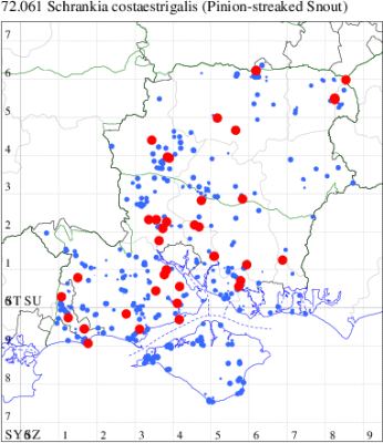 VC11: Brockwood, one, 15 Sep (SDut); Blashford Lakes HIWWT NR, one, 03 Jun; one, 10 Jun; one, 22 Jul; one, 05 Aug; one, 26 Aug; one, 27 Sep (PWhtk); Pig Bush, NF, one, at dusk, gen. det., 20 Aug (AMD); Marchwood, one, 29 Jul (TDCh); one, 28 Jun; two, 11 Sep; one, 09 Sep; one, 11 Sep; Lee, one, 02 Sep; one, 08 Sep; one, 16 Sep (CTha); Stanbridge Earls, one, 25 Sep; one, 01 Oct (JRM); Fishlake Meadows, one, 15 Jun (NRJ); Romsey, one, 21 Aug; one, 09 Sep (MJB); one, 11 Jun; one, 15 Aug; one, 22 Aug; one, 05 Sep; two, 24 Sep (NRJ); Needs Ore NNR, one, 23 Jul (PCra); Dibden Purlieu, NF, one, 18 Jul; one, 29 Aug; one, 11 Sep; one, 17 Sep (RAC); Allbrook, one, 27 Jul; one, 09 Sep (SIng); Highbridge, Eastleigh, one, 19 Aug (SIng, PPir); Winchester, one, 21 Jun; one, 11 Aug; one, 26 Aug; one, 05 Sep (THW); Fareham, one, 11 Sep (IMcP); one, 13 Aug (KJW); Botley, one, 11 Jun; one, 12 Sep; one, 15 Sep (SLB); Wickham, one, 15 Jun; one, 07 Jul; one, 04 Sep; one, 05 Sep; one, 08 Sep; one, 09 Oct (JRDS); Lovedean, one, 19 Jun (ARJa); Hurn, one, 09 Jun; one, 10 Jun; four, 11 Jun; one, 22 Jun; one, 11 Jul; one, 14 Jul; one, 18 Aug; two, 19 Aug; three, 12 Sep; one, 24 Sep (MJef); Burton, nr Christchurch, one, 20 Oct (JStw); Hengistbury Head, one, 27 Jun (MJef); Sway, one, 16 Sep; one, 09 Oct (SKee); Pennington, one, 11 Aug; one, 28 Aug (RFC); Needs Ore NNR, three, 10 Jun; one, 09 Aug; one, 16 Aug (CNB);