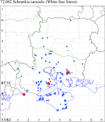 Local in damp woodland, fens, damp meadows and boggy heathland throughout England and Wales, and also in the Scottish Highlands. Widespread and locally common in Hampshire and on the Isle of Wight. Wingspan 19-22 mm. Small size suggests a species of micromoth, but most resembles White-line Snout S. taenialis. Larva feeds on Heather, Wild Marjoram and Wild Thyme.
