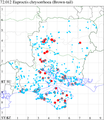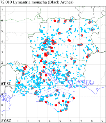 For the maps, all records prior to 2020 are shown by a blue dot (the larger the dot, the more recent), with the current year's records shown in red. As previous records are superimposed on any report for 2020, new sites have greater emphasis (i.e. will show as 'more red').
