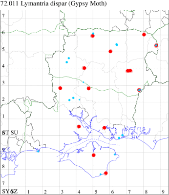 VC11: Woodlands, New Forest, present, 26 Jun (RBW); Totton, one, 23 Jun; one, 24 Jun (LH); Romsey, one, 25 Jun (SC); one, 09 Jun; one, 18 Jul (MB); Stockbridge Down NT, one, to actinic, 19 Jun (GCE); Allbrook, one, 24 Jun; one, 15 Jul (SI); Winchester, one, 07 Jul (THW); Fareham, one, ♀, 16 Jun (KJW); Shirrell Heath, one, 07 Jul; one, 11 Jul (LEdg); Portsmouth, one, 15 Jun; four, 20 Jun; one, 25 Jun; six, 26 Jun; one, 07 Jul; two, 10 Jul; one, 12 Jul; one, 13 Jul; one, 16 Jul; one, 17 Jul; one, 21 Jul; one, 22 Jul (IRT); Northney, Hayling Island, present, 17 Jun; present, 19 Jun; present, 20 Jun; present, 21 Jun (JWP);