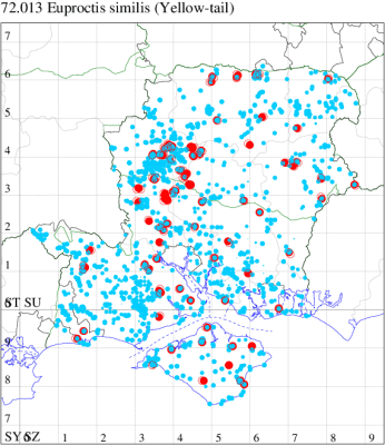 Common in hedgerows, woodland, scrub and gardens throughout England, increasingly also in Scotland. Widespread and common in Hampshire and on the Isle of Wight. Wingspan male 35-42 mm, female 37-45 mm. The main confusion species are Brown-tail E. chrysorrhoea, in which the underside of the abdomen is covered in brown hairs, and White Satin Leucoma salicis which lacks the yellow abdomen of E. similis and has legs ringed black and white. Larva feeds on Hawthorn, Blackthorn, Hazel, Pedunculate and Sessile Oak, Silver and Downy Birch, Sallow and Elm.