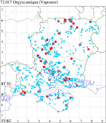 Common in urban gardens and parks, open woodland, fens, hedgerows, heathland and moorland throughout the British Isles. Widespread and common in Hampshire and on the Isle of Wight. Wingspan male 35-38 mm, female wingless. Male day-flying, occasionally coming to light. The main confusion species is Scarce Vapourer O. recens, which differs in having a white subapical spot. Larva feeds on various broad-leaved trees and shrubs, including Birch, Hazel, Sallow, Hawthorn, Blackthorn, Elm, Lime and Oak, over-wintering as an egg.