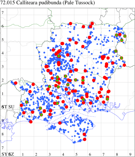 For the maps, all records prior to 2024 are shown by a blue dot (the larger the dot, the more recent), with the current year's records shown in red. As previous records are superimposed on any report for 2024, new sites have greater emphasis (i.e. will show as 'more red').