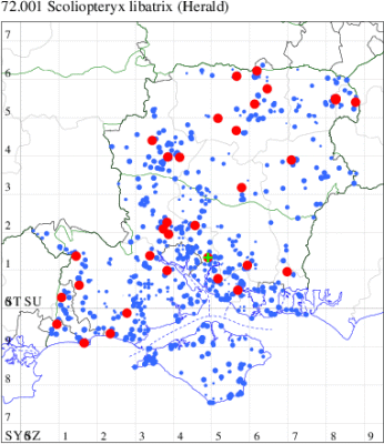 For the maps, all records prior to 2023 are shown by a blue dot (the larger the dot, the more recent), with the current year's records shown in red. As previous records are superimposed on any report for 2023, new sites have greater emphasis (i.e. will show as 'more red').
