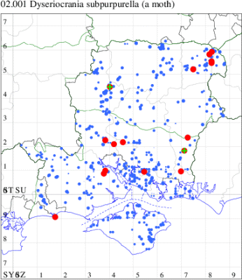For the maps, all records prior to 2023 are shown by a blue dot (the larger the dot, the more recent), with the current year's records shown in red. As previous records are superimposed on any report for 2023, new sites have greater emphasis (i.e. will show as 'more red').