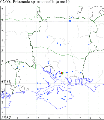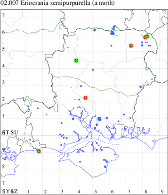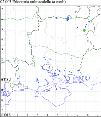 Local in birch woodland throughout Britain, with a scattered, discontinuous distribution. The distribution in Hampshire and on the Isle of Wight follows a similar pattern to other Eriocrania, being mainly restricted to the woodlands of the south, along the north edge of Wight, and around the north-eastern heaths. Wingspan 9-12 mm. Day-flying. Adults difficult to distinguish from other Eriocrania species, and more reliably recorded in the larval stage. Larva mines leaves of Birch, over-wintering as a pupa.