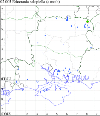 Local in birch woodland throughout the British Isles. In Hampshire and on the Isle of Wight local and evidently rather uncommon amongst birch, most frequently in southern Hampshire. Wingspan 10-13 mm. E. salopiella has a similar pattern and wing shape but is normally suffused with purple and bright blue (MBGBI Vol 1). Larva mines leaves of Birch, over-wintering as a pupa.