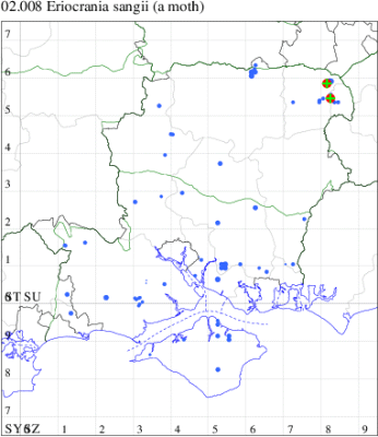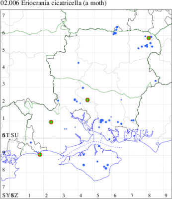 VC11: Highland Water Inclosure, NF*, mine, two, 07 May (AMD); Otterbourne, mine, present, betula, 03 May (JOug); Hengistbury Head, larva, one, field observation, 10 May (BGD);