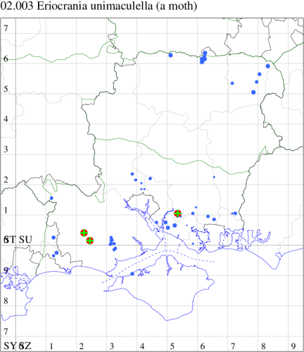 Common in birch woodland throughout the British Isles. Fairly widely distributed in Hampshire and on the Isle of Wight, where it is the most common of the six birch feeding Eriocrania species. Wingspan 9-14 mm. Day-flying. Very similar to E. sangii, from which separated only by dissection of the genitalia. Larva mines leaves of Birch, over-wintering as a pupa.