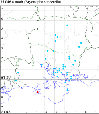 Local in urban areas, old buildings and rocky areas throughout the British Isles, except for the Highlands and Islands of Scotland. In Hampshire frequent only in the south-east, and very much less common elsewhere in the county and on the Isle of Wight. Wingspan 9-13 mm. The brown colour and the dark line running over the vertex of the head distinguish B. senectella from similar looking species, but very dark forms resemble B. similis; in case of doubt, they can be separated by the pale yellow labial palpus and frons of B. senectella (creamy white in B. similis). Larva feeds on various mosses, living within a silken tube or tent.