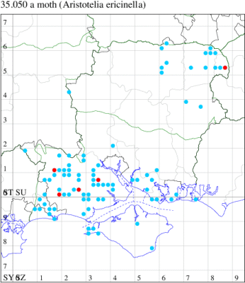 Local on heathland throughout England and Wales. In Hampshire fairly common on the heaths of the New Forest and the north-east, but very local elsewhere. Not recorded from the Isle of Wight since 1975. Wingspan 12-13 mm. Flies in afternoon, and occasionally comes to light. One of the more distinctive gelechiids, unlikely to be confused with any other species. Larva feeds on Heather, living between shoots spun together with silk, and over-wintering as an egg.