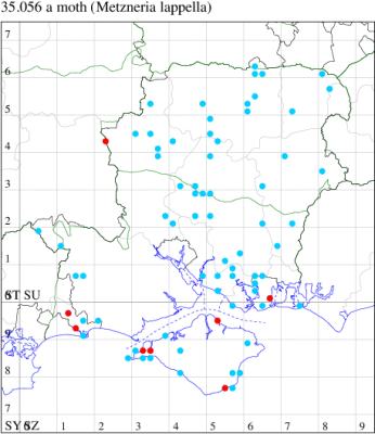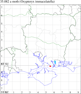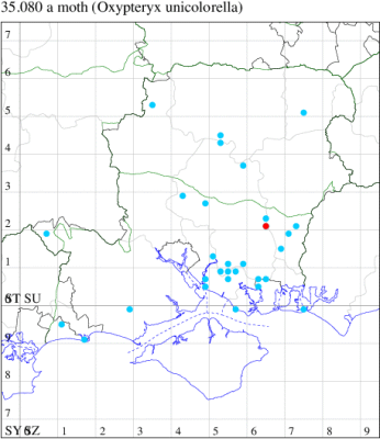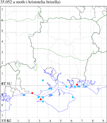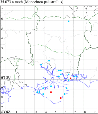 Nationally scarce (Nb) in saltmarshes on the south and east coasts of England, from Cornwall to Durham, and from Lancashire on the west coast (MBGBI Vol 4 part 2). In Hampshire still found in small numbers on the south coast from Hurst Castle in the west to Hayling Island in the east. Not recorded from the Isle of Wight since 1970. Wingspan 9-10 mm. Fairly frequent at light, and also occasionally netted during the day; a reasonably distinctive gelechiid. Larva feeds within flowers of Thrift and Common Sea-lavender, over-wintering as a pupa.