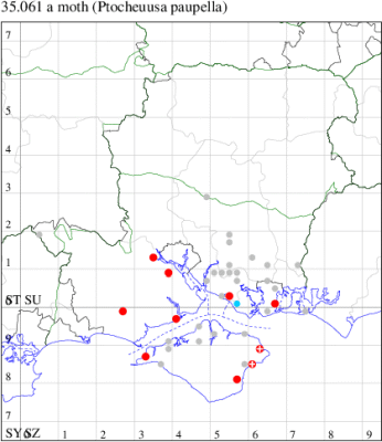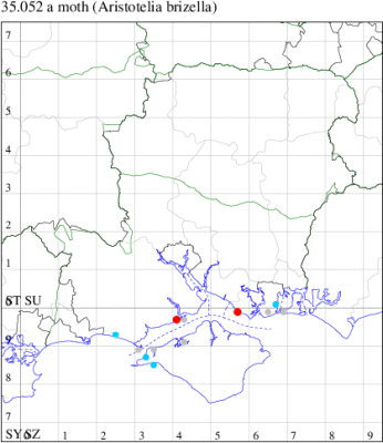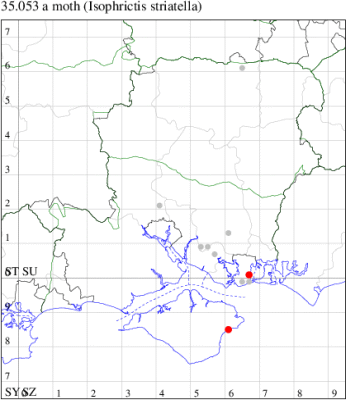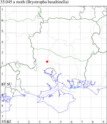 Nationally scarce (Nb) in saltmarshes on the south and east coasts of England, from Cornwall to Durham, and from Lancashire on the west coast (MBGBI Vol 4 part 2). In Hampshire still found in small numbers on the south coast from Hurst Castle in the west to Hayling Island in the east. Not recorded from the Isle of Wight since 1970. Wingspan 9-10 mm. Fairly frequent at light, and also occasionally netted during the day; a reasonably distinctive gelechiid. Larva feeds within flowers of Thrift and Common Sea-lavender, over-wintering as a pupa.