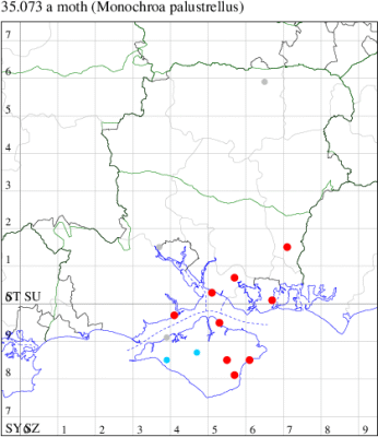 Local in marshes, water meadows, fens and by river-banks throughout much of England, Wales and southern Ireland. In Hampshire the main population is centred in the south-east of the county in and around Fareham, Southsea, Botley Wood and along the west side of Langstone Harbour; in the north of the county, recorded recently only from the Deadwater Valley, formerly known from Alice Holt and Itchen Abbas. Not recorded from the Isle of Wight to date. Wingspan 12-14 mm. Larva feeds within stems of Common Spike-rush.