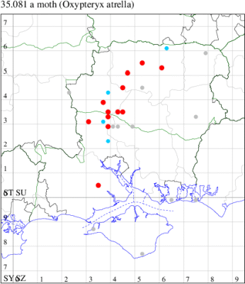 Nationally scarce (Nb) in waste ground and dry open areas throughout much of southern England and Wales, rare elsewhere. In south Hampshire, the population is mainly centred around Botley Wood with outlying records from Queen Elizabeth Country Park and St Catherine's Hill HWT reserve, while in the north of the county, there are records from Micheldever Wood, Wildhern and Abbotstone Down. Reported new for the Isle of Wight in 2022. Wingspan 10-13 mm. Can be separated with care from Monochroa tenebrella, in which segment 3 of the labial palpus is shorter than segment 2, and, in the female, the apical third of the antenna is white. Larva feeds within stems of Perforate St John's-wort.