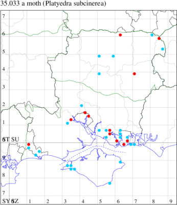 Nationally scarce (Nb) in rough ground and gardens in parts of southern England. In Hampshire recorded frequently and in numbers along the south-east coastal strip. Inland, and on the Isle of Wight, there are only scattered records. Wingspan 16-18 mm. The larva feeds on flowers and seeds of Common Mallow and Hollyhock.