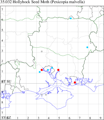 Nationally scarce (Nb) in rough ground and gardens in parts of southern England. In Hampshire recorded frequently and in numbers along the south-east coastal strip. Inland, and on the Isle of Wight, there are only scattered records. Wingspan 16-18 mm. The larva feeds on flowers and seeds of Common Mallow and Hollyhock.