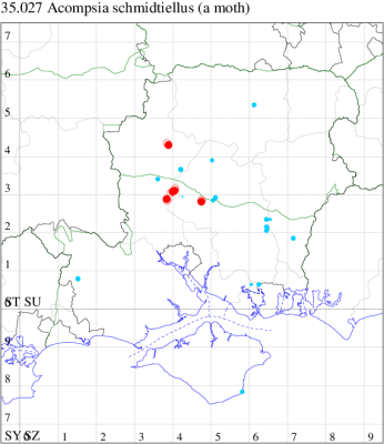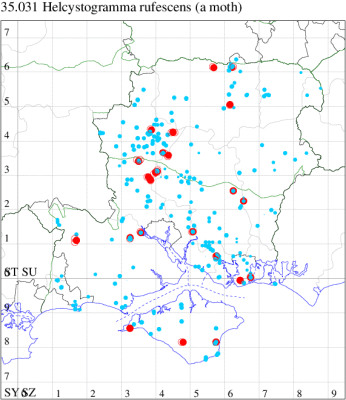 VC12: Cholderton, four, 24 Jul; present, 31 Jul; one, 08 Aug (TJN, HE); one, field observation, 11 Aug (TJN, LF); Harewood Forest, one, to actinic, 23 Jul; Chilbolton, one, to actinic, 14 Jul; Crawley, two, to actinic, 21 Jul; Barton Stacey, one, to actinic, 11 Aug; one, to actinic, 11 Aug (GCE); Axmansford*, one, 13 Jul (ACB det. GJD); Basingstoke, one, 23 Jul (RHil); Pamber Forest, one, 13 Jul (GJD)