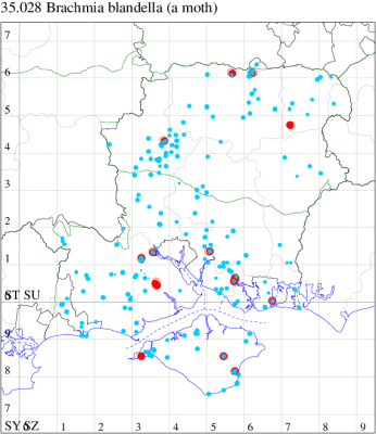 For the maps, all records prior to 2020 are shown by a blue dot (the larger the dot, the more recent), with the current year's records shown in red. As previous records are superimposed on any report for 2020, new sites have greater emphasis (i.e. will show as 'more red').