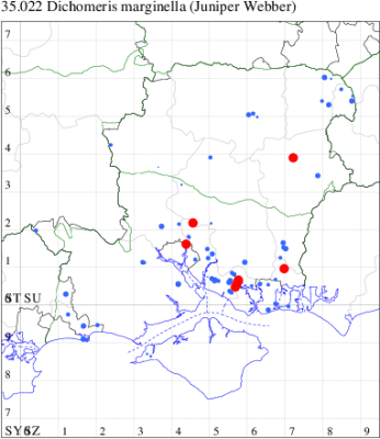 VC12: Magdalen Hill Down NR, one, gen. det., 07 Aug (AMD); Morn Hill, Winchester, one, 28 Jul (CRB, PDF, DAS, LHur); one, 11 Aug (CRB, DAS); Noar Hill HIWWT NR, Selborne*, one, 11 Aug (AMD, FHay det. AMD)