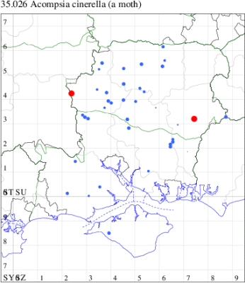 A local species in a wide range of habitats throughout south-eastern England, north to Yorkshire and west to Herefordshire. In Hampshire historically known from only a handful of sites, mainly in the south of the county, most notably near Ashurst in the New Forest; and not recorded in north Hampshire until 2005. Since then, the species has seemingly undergone a range expansion and is widespread in scattered localities. Wingspan 13-14 mm. A relatively distinctive insect which when fresh should be identifiable without recourse to collection: the patterning of the scale tufts, and pale costal spots at 3/4 are diagnostic. Larva feeds on lichens growing on tree trunks and wooden fences.