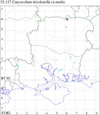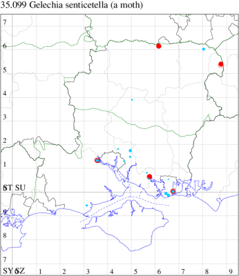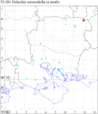 Local on heathland, moorland and in woodland clearings throughout much of England. Very local and uncommon in Hampshire and on the Isle of Wight, where most frequent on the coast, and around the eastern heaths, but apparently absent from much of the New Forest. Wingspan 14-19 mm. Flies in afternoon sunshine and at night. A relatively distinctive and well-marked gelechiid, but confirmation of worn or poorly marked specimens only possible by dissection of the genitalia. Larva feeds on Sheep's Sorrel, living within a silken tube or tent.