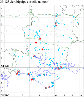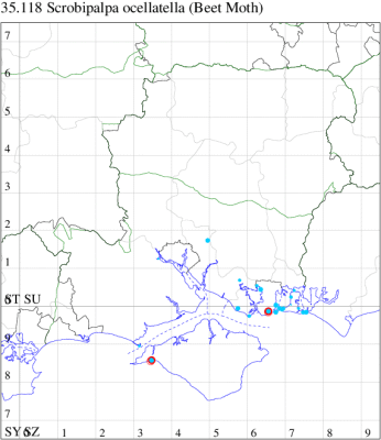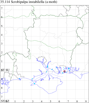 Nationally scarce (Nb) on saltmarshes, mud-flats and estuaries along parts of the coast of England and Wales, uncommonly in Scotland and Ireland. In Hampshire widely distributed along the coast from Hurst Castle in the west to the eastern side of Hayling Island. Not recorded from the Isle of Wight since 1926. Wingspan 12-14 mm. S. instabilella can be confused with S. salinella, although they can be distinguished by small but constant differences in their genitalia; some examples of S. samadensis can also be similar, but S. instabilella generally has more heavily marked stigmata (MBGBI Vol 4 part 2). Larva mines leaves of Sea-purslane, Grass-leaved Orache, Sea Aster and Glasswort.