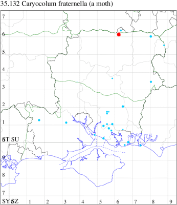 Local in dry grassland, heaths and damp open areas in Britain, as far north as East Lothian, being more common in the south-east (MBGBI Vol 4 part 2). In Hampshire the population is largely confined to the south-east of the county, notably around Wickham Common Botley Wood and The Moors NR, Bishop's Waltham, but also in Southsea and along the coast from Hook in the west to Hayling Island in the east. In the north of the county, sparsely distributed but nowhere common. Not recorded from the Isle of Wight to date. Wingspan 9-13 mm. Only C. viscariella and dark forms of C. marmoreum have similar coloration; in C. viscariella the dark bar from the plical spot clearly reaches the costa, whereas in C. fraternella it is lost in the fuscous ground colour of the costa; C. marmoreum has the costal and dorsal white spots much reduced in dark specimens (MBGBI Vol 4 part 2).