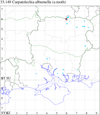 Local in woodland and heathland throughout England, north Wales and the Scottish Highlands. In Hampshire there are scattered record in both vice-counties. Not recorded from the Isle of Wight to date. Wingspan 12-14 mm. The main confusion species is C. proximella, from which C. alburnella can be distinguished by the clear white coloration of segment 2 of the labial palpus (MBGBI Vol 4 part 2); see also C. decorella. Larva feeds on Birch, living within a spun or rolled leaf.