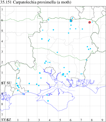 Common in open woodland and scrub throughout the British Isles. In Hampshire recorded annually in small numbers from widely scattered locations across the county. Not recorded from the Isle of Wight since 1977. Wingspan 13-16 mm. The main confusion species is C. alburnella, which is generally a much lighter species, except in Scotland where dark forms predominate, and from which reliably distinguished by outer side of second segment of labial palpus, which is spotted fuscous at base in C. proximella (MBGBI Vol 4 part 2); see also C. decorella. Larva feeds on Birch and Alder, living within a spun or rolled leaf, and over-wintering as a pupa.