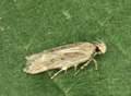 Local in hedgerows and orchards throughout much of England and northern Wales. In Hampshire the main population centres are in the New Forest and between the Hamble and Wallington rivers; there are few records elsewhere in the county or on the Isle of Wight. Wingspan 14-15 mm. Larva feeds on Hawthorn, Apple and Rowan, living within a spun or rolled leaf.