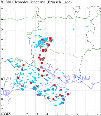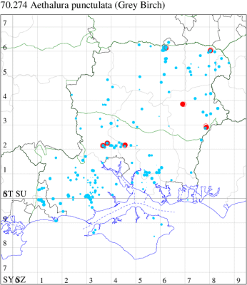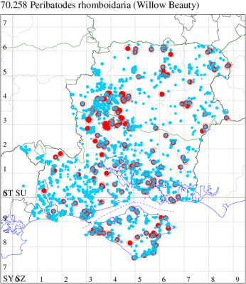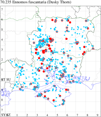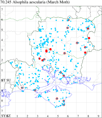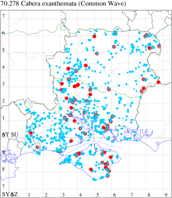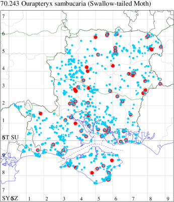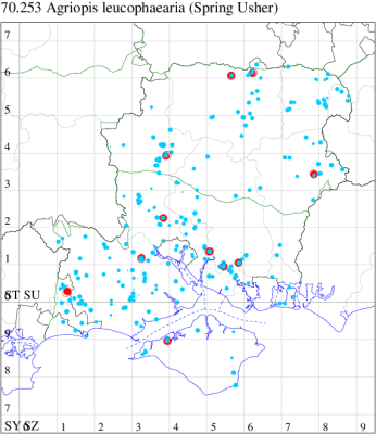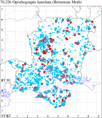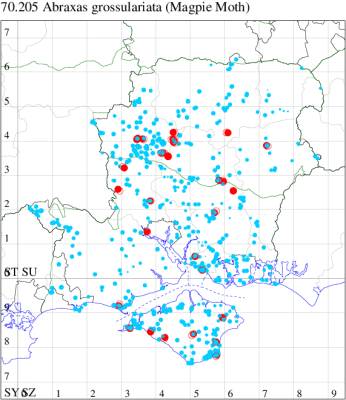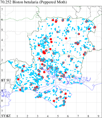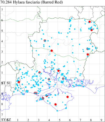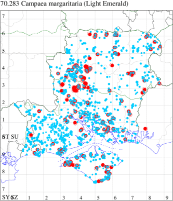 For the maps, all records prior to 2020 are shown by a blue dot (the larger the dot, the more recent), with the current year's records shown in red. As previous records are superimposed on any report for 2020, new sites have greater emphasis (i.e. will show as 'more red').