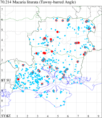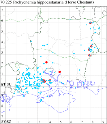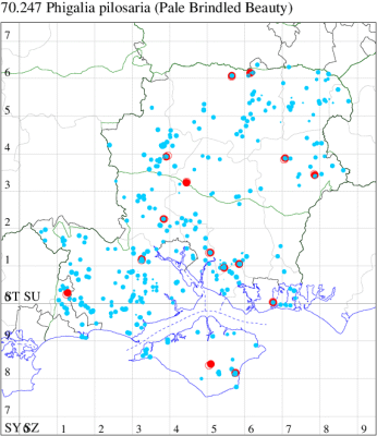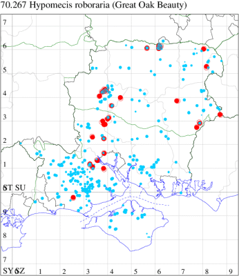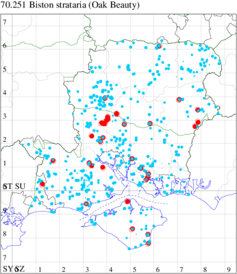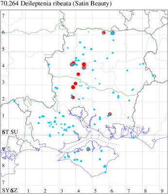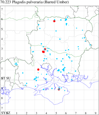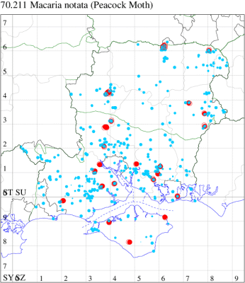 VC11: Breamore*, one, field observation, 26 Aug (SWan); Lockerley, one, 24 Jun (RJen); Redbridge, one, 28 Jun (WGin); Romsey, one, to actinic, 22 May; one, 12 Aug (NRJ); Broughton, one, to actinic, 06 Aug (GCE); Eastleigh, one, to actinic, 06 Jul; one, to actinic, 07 Aug (KArb); Up Somborne, one, field observation, 07 Jul (CWoo); Locks Heath, one, 13 Jun (PAS); Titchfield Haven NNR, one, 17 Jul (F.M.G.); Hilltop, The Hangers, three, 01 Aug (SI); West Meon, two, 31 Jul (F.M.G.); Northney, Hayling Island, present, 20 Jun (JWP); Petersfield*, one, to actinic, 27 Jul (RAll); Milford on Sea, one, 31 Jul; one, 05 Aug (MMcM);