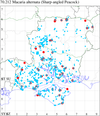 Local in broad-leaved woodland, scrubby heathland and sand-dunes throughout much of England, more commonly in the south. In Hampshire and on the Isle of Wight fairly common throughout, being the rather more common of the two similar Macaria species. Wingspan 27-32 mm. The main confusion species is Peacock Moth M. notata, but in M. alternata there is usually an indistinct grey band running through the blotch in the centre of the forewing, across both forewing and hindwing, and the apical markings are bolder, accentuating the more pointed apex and deeper notch in the termen. Larva feeds on Sallow, Blackthorn, Sea Buckthorn and Alder, over-wintering as a pupa.
