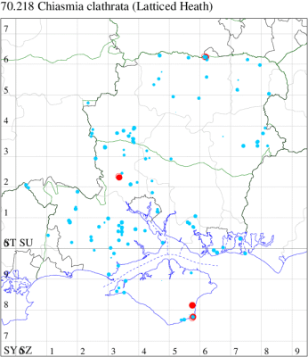 Common in farmland, gardens, calcareous grassland, acid heathland and moorland throughout most of the British Isles, a species of conservation concern under the UK Biodiversity Action Plan. In Hampshire and on the Isle of Wight quite common on the chalk and in waste places with clover, and also found in clover crops. Wingspan 26-32 mm. Flies both by day, in warm sunshine, and at night. Although distinctive, it has been confused with Common Heath Ematurga atomaria, but only Latticed Heath has such conspicuous, black veins; there is a confusing black form alboguttata, which is best distinguished by the chequered fringes. Larva feeds on Hare's-foot Clover, White Clover, Red Clover, Bird's-foot Trefoil and Lucerne, over-wintering as a pupa.