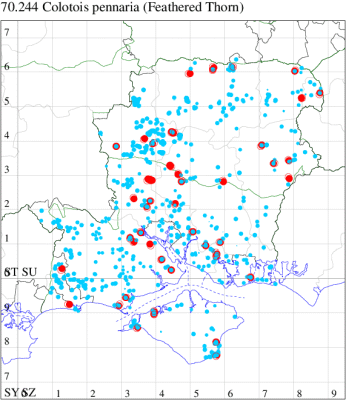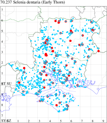 Nationally scarce (Nb) in open woodland, woodland rides and scrub in southern England (Hampshire and adjoining counties) and from north Somerset up through Gloucestershire and Monmouthshire into Herefordshire, with a few isolated populations elsewhere in England and southern Ireland. In Hampshire and on the Isle of Wight local but quite frequent in many woodland localities. Wingspan 27-30 mm. Small size renders this 'thorn' fairly unmistakable. Larva feeds on Bramble, in neutral or basic habitats, or Bilberry in those which are acid, over-wintering as a pupa.
