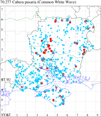 Common in broad-leaved, often damp, woodland throughout much of the British Isles; frequently recorded and well distributed across Hampshire and the Isle of Wight. Wingspan 30-35 mm. The main confusion species is Common White Wave C. pusaria, in which the cross-lines are straight and grey. Larva feeds on Goat Willow, Grey Willow, Aspen and Poplar, over-wintering as a pupa.