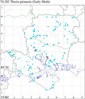 Common in open woodland, woodland edges, scrub and mature hedgerows throughout England, Wales and southern Scotland. In Hampshire and on the Isle of Wight common to abundant in late winter amongst hawthorn in open country and on the downs. Wingspan male 32-37 mm, female wingless. Males could be confused with Sloe Carpet Aleucis distinctata, but Early Moth has straighter distal edge of central band and females have band on vestigial wings. The flightless females may be found sitting on the leafless twigs after dark. Larva feeds on Blackthorn, Hawthorn and Midland Hawthorn.