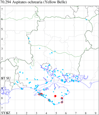Local on sand-dunes, shingle beaches, saltmarshes, golf courses and heathland, along the coasts of southern England, predominantly coastal. In Hampshire and on the Isle of Wight frequent on dunes and shingle in coastal localities, rare inland on the chalk. Wingspan 28-36 mm. The most likely confusion species is Straw Belle Aspitates gilvaria, but Yellow Belle has a more rounded forewing and more distinct antemedian fascia. Larva feeds on Sea Wormwood, Hare's-foot Clover, Smooth Tare, Bird's-foot Trefoil, Common Restharrow, Wild Carrot and Beaked Hawk's-beard.