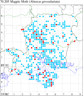 Common on moorland, in gardens and allotments throughout much of the British Isles. In Hampshire and on the Isle of Wight widespread, but far less common than in the past - it used to be a common garden moth throughout the region. Wingspan 42-48 mm. Unmistakable. Larva feeds on Heather, Blackthorn, Hawthorn, Hazel, Black Currant, Red Currant, Gooseberry and Spindle.