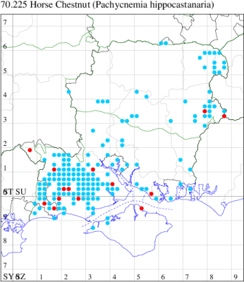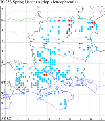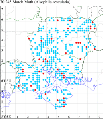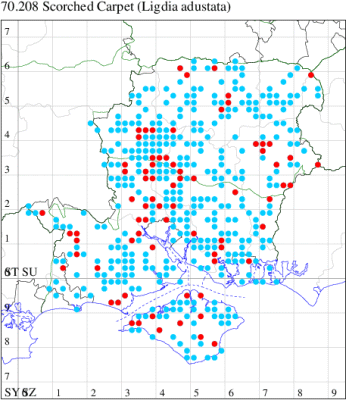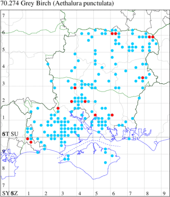 For the maps, all records prior to 2021 are shown by a blue dot (the larger the dot, the more recent), with the current year's records shown in red. As previous records are superimposed on any report for 2021, new sites have greater emphasis (i.e. will show as 'more red').