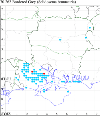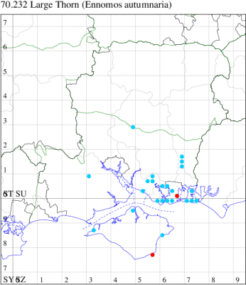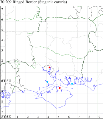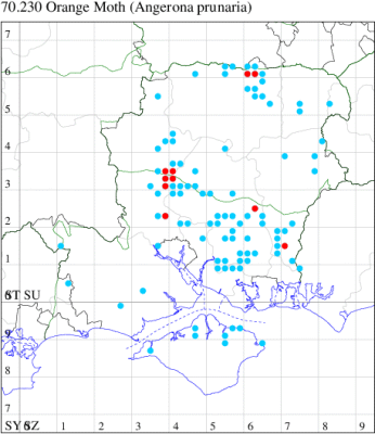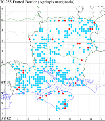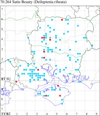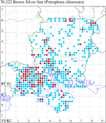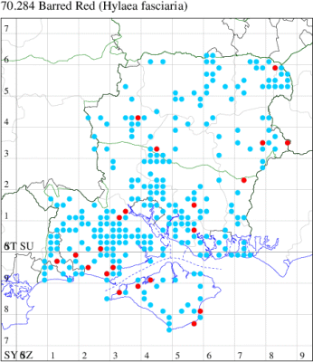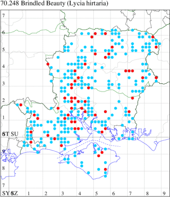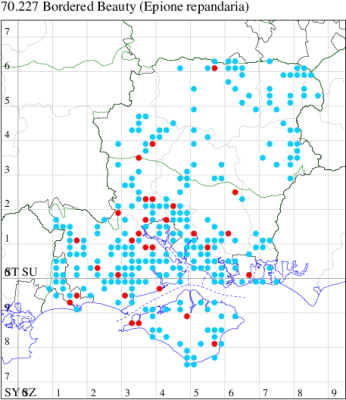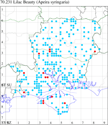 VC11: Frogham, NF, one, 22 Jul; one, 03 Aug (DBrd); Marchwood, one, 13 Aug (TDCh); Totton, one, 16 Aug (TRac); one, 15 Jun; one, 18 Jun; one, 29 Jun; one, 30 Jun; one, 01 Jul (LHan); Romsey, one, 27 Jun (NRJ); Broughton, one, 15 Aug; one, 15 Aug; one, 25 Jul (GCE); Stanbrige Earls, one, 21 Aug (JRM); Bishopstoke, one, field observation, 05 Jul (DHub); present, field observation, 27 Aug (OMor); Winchester, one, 25 Jul (THW); Titchfield Haven NNR, one, 25 Jun (RJD, DWal, KJW, RCar, DHun); Fareham, one, 10 Jul; one, to light, 14 Aug (KJW); Dundridge, one, field observation, 22 Jul (DTru); Muscliffe, one, 25 Aug (SDar); Hurn, one, 30 Jun; Hengistbury Head, one, 11 Aug (MJef); Milford on Sea, one, 17 Aug; Keyhaven, one, 15 Aug (MMcM); Needs Ore NNR, 11, 19 Aug (PCra); 12, 18 Aug (CNB); one, 19 Aug (PCra);