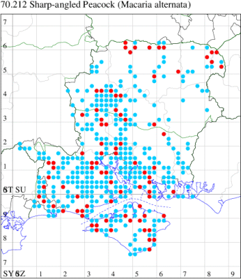 Local in broad-leaved woodland, scrubby heathland and sand-dunes throughout much of England, more commonly in the south. In Hampshire and on the Isle of Wight fairly common throughout, being the rather more common of the two similar Macaria species. Wingspan 27-32 mm. The main confusion species is Peacock Moth M. notata, but in M. alternata there is usually an indistinct grey band running through the blotch in the centre of the forewing, across both forewing and hindwing, and the apical markings are bolder, accentuating the more pointed apex and deeper notch in the termen. Larva feeds on Sallow, Blackthorn, Sea Buckthorn and Alder, over-wintering as a pupa.